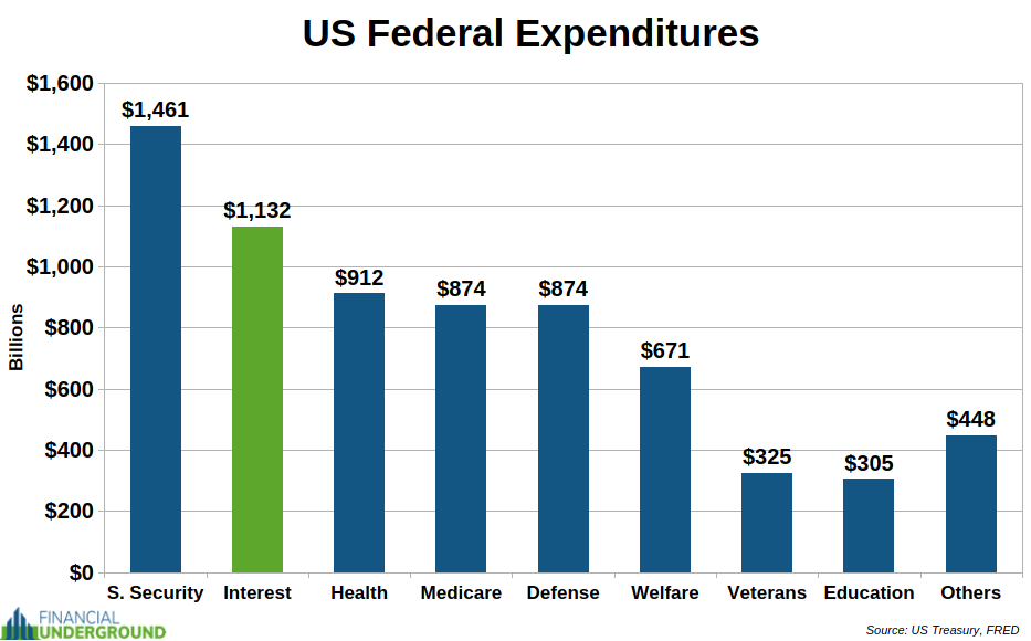 That means interest expense will keep exploding. It has already surpassed the defense budget and is on track to exceed Social Security soon. At that point, interest could consume most federal tax revenue.