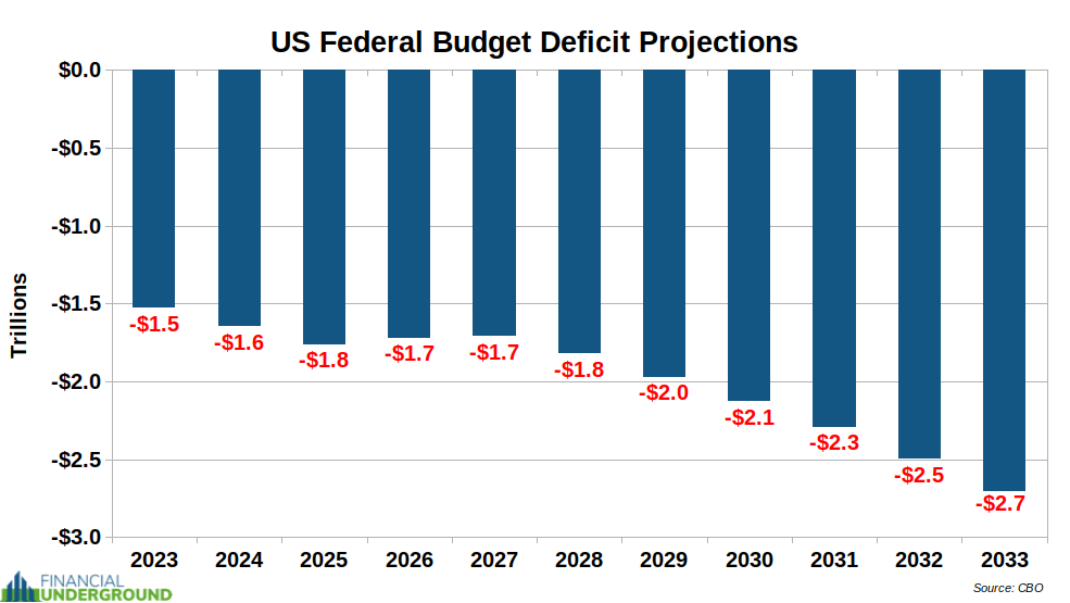 Even by the CBO’s optimistic projections, the US government will have a cumulative deficit of over $20 TRILLION for the next ten years that will have to be financed by issuing more Treasuries.