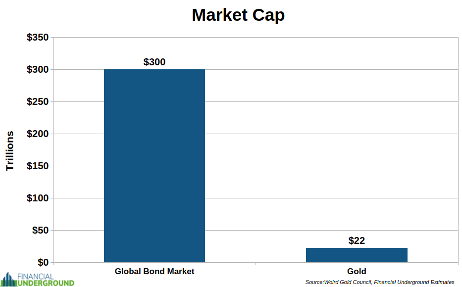 Compare that to all the gold ever mined in the world: worth about $22 trillion. That’s a mere 7% of the global bond market.