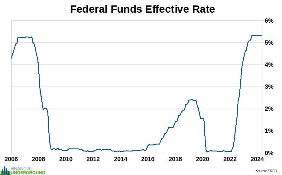 Inflation subsequently hit 40-year highs in 2022, forcing the Fed into another rate-hiking cycle, one of the steepest in history. In just 18 months, the Fed hiked rates from around 0% to over 5%, where they remain today.
