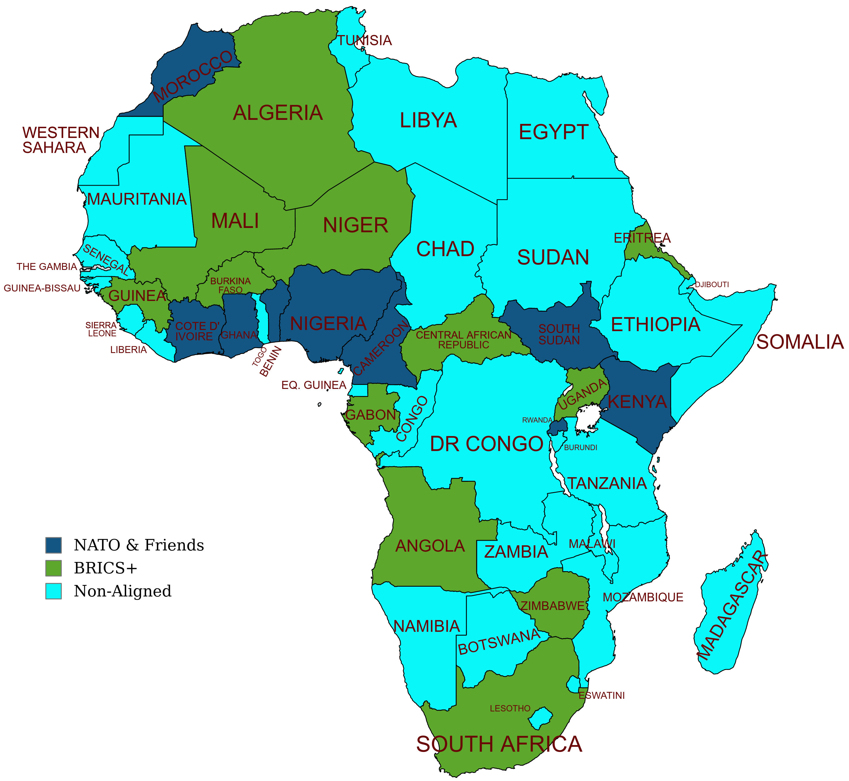 Some countries don’t fall decisively into one category. For example, Egypt is a major US ally and a member of the BRICS+. I’ve put these countries in a separate Non-Aligned category in the above map. They are prime arenas of competition for NATO & Friends and BRICS+.
