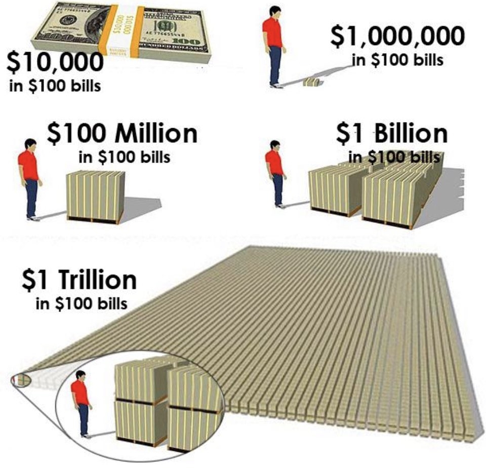 If you took that same trillion one-dollar bills and instead stacked them end-to-end, the length would exceed the distance between the Earth and the sun.