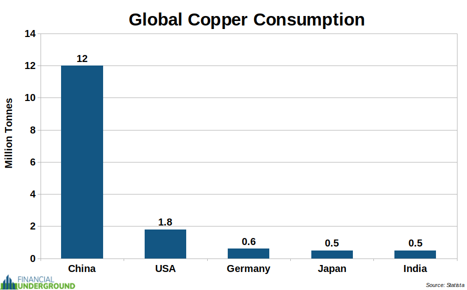 China is by far the largest consumer of copper in the world, accounting for approximately 50% of global copper consumption. China’s rapid industrialization, urbanization, and infrastructure development drive its copper consumption.