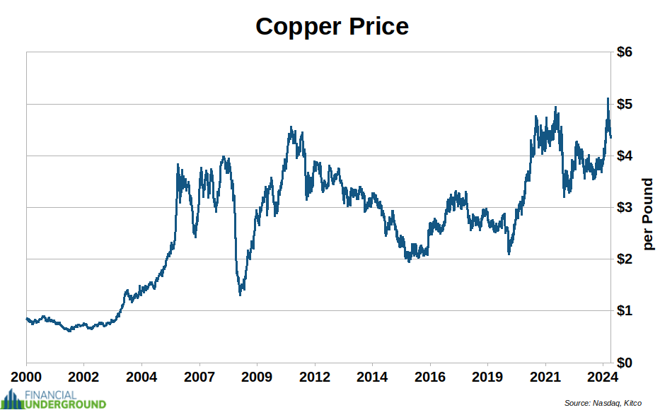 Copper prices started to rise in the early 2000s as China became a significant demand driver due to its rapid industrialization and urbanization. This led to a sharp rise in copper prices, peaking at around $4.50 per pound in 2006.
